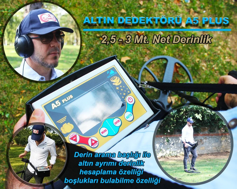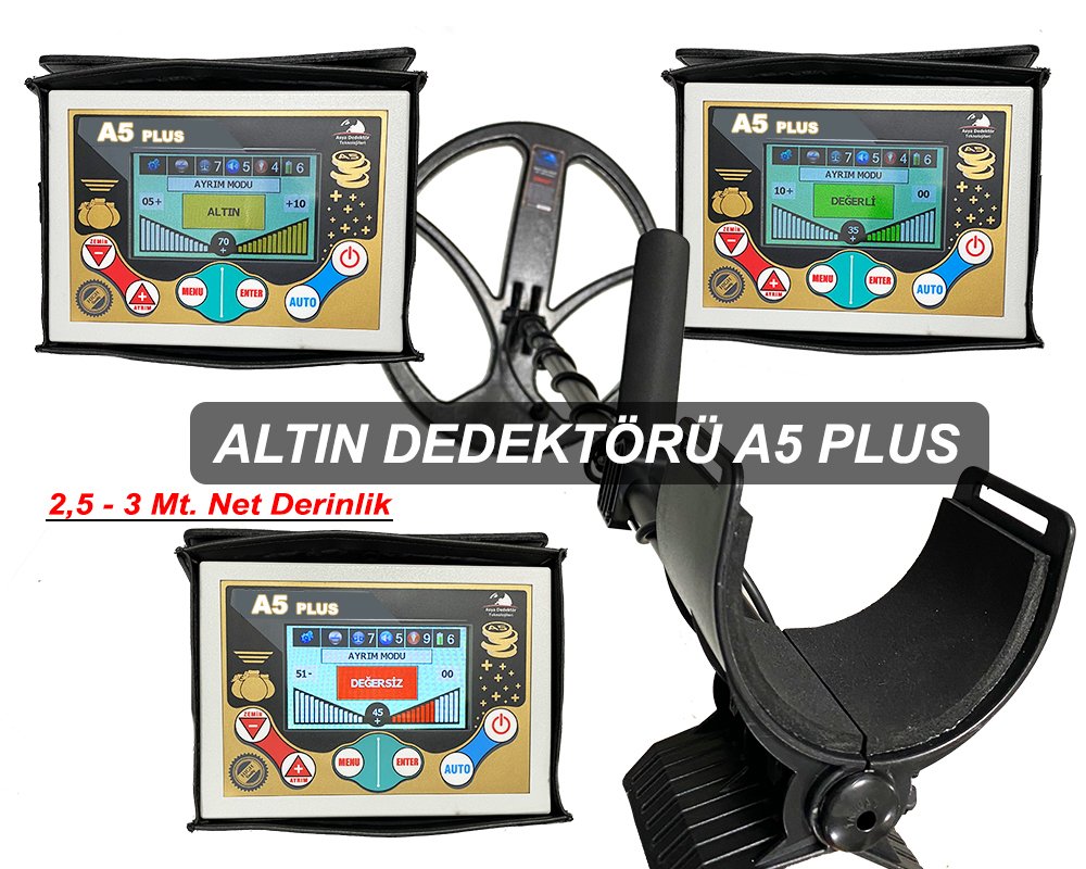 A5 dedektör, derin altın ve define arama dedektörü 2,5-3 Mt. derinliklere sahiptir. A5 plus Türkçe dili dışında dünya dillerine göre tasarım ve üretim yapılmaktadır. A5 plus 2,5-3 mt derinliklerdeki altın objeleri bronz parçaları ve paraları gümüş para ve takıları toprak altında kayaların içine yapılmış oda mezarları  tünelleri kapatılmış kuyuları bulabilme özelliğine sahiptir.